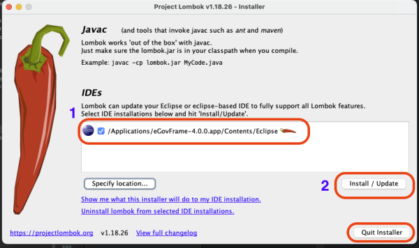 lombok.jar 파일을 클릭해서 실행을 시키면 다음과 같은 화면이 뜬다
